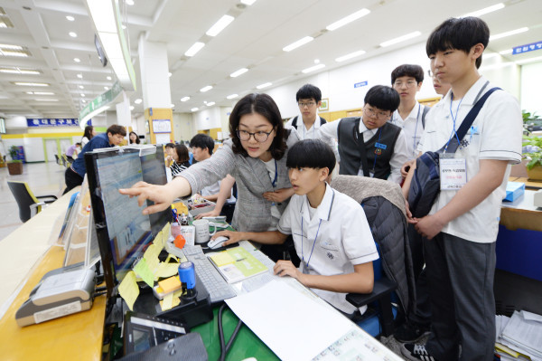 동대문구는 30일 오전 전동중학교 1학년 학생 8명을 대상으로 올해 첫 ‘공무원 직업체험’을 진행했다. 사진은 체험에 참가한 학생이 구청 민원대에서 민원서류를 직접 발급하고 있는 모습. (사진제공=동대문구청)