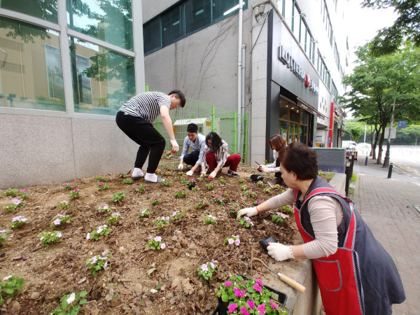 경기 용인시 수지구 신봉동은 청사 지하주차장 출입구에서 쓰레기 무단투기가 빈번히 발생해 미관을 해치고 있어 이를 해결하자는 취지로 지난 29일 청사 지하주차장 출입구 양쪽 유휴 공간에 화단을 조성했다. 사진은 화단 조성에 참여한 관계자들의 모습. (사진제공=용인시청)