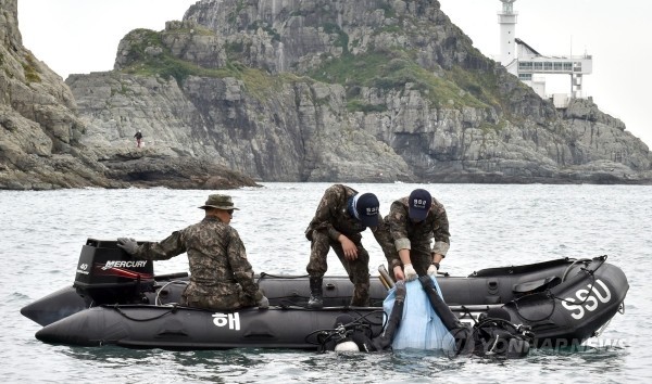 해군작전사령부 장병들이 바다의 날인 31일 부산 오륙도 인근 바다에서 정화활동을 벌이고 있다.