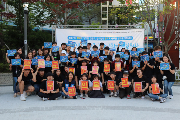 경기 양평군청소년상담복지센터가 최근 동서부로 나눠 중·고등학교 각 8개교와 지역내 청소년을 대상으로 양평역과 양평물맑은 쉼터 광장에 투표소를 설치하고 ‘양평군 청소년 모의투표’를 실시했다. 사진은 투표 후 기념촬영을 하고 있는 청소년들의 모습.(사진제공=양평군청)