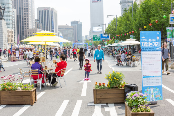 | ▲ 세종대로에서 운영된 '차 없는 거리'에서 즐거운 한때를 보내고 있는 시민들. | ||
