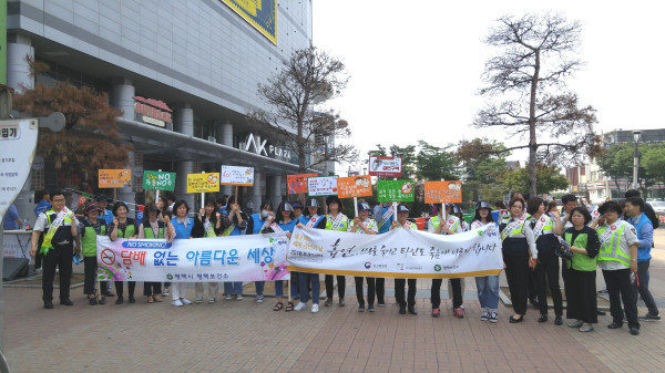 경기 평택시보건소는 지난 5월31일 ‘제31회 세계금연의 날’을 맞이해 평택시민경찰연합회 및 평택교육지원청과 공조해 평택역 광장 일원에서 ‘금연실천 다짐 캠페인’을 실시했다. 사진은 봉사자들이 피켓과 현수막을 들고 캠페인에 참여하고 있는 모습. (사진제공=평택시청)