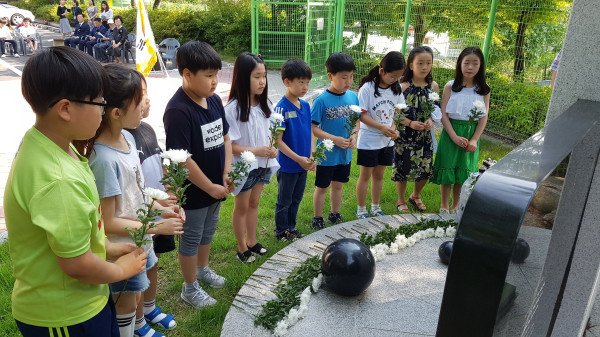 경기 가평군에 소재한 가평초등학교에서는 5일 가평초 출신 6.25 참전용사 호국명비 앞에서 제63회 현충일 추념식을 진행했다. 사진은 추념식에 참여한 학생들이 헌화하고 있는 모습. (사진제공=가평초등학교)