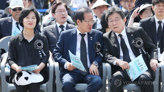 더불어민주당 추미애 대표(왼쪽부터), 자유한국당 홍준표 대표, 바른미래당 유승민 공동대표가 6일 오전 대전 현충원에서 열린 제63회 현충일 추념식에 참석해 자리에 앉아 있다.