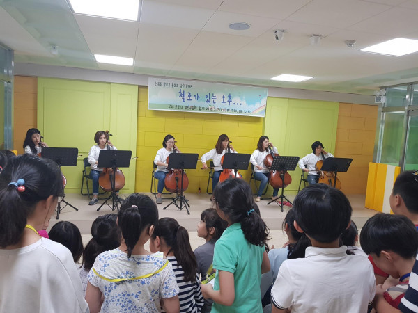 경기 김포시 신곡초등학교는 최근 교내 공감배움터에서 학생·학부모·교직원이 참석한 가운데 ‘첼로가 있는 오후, 점심시간 작은 음악회’를 개최했다. 사진은 신곡초 학부모 첼로 동아리에서 공연을 진행하고 있는 모습. (사진제공=신곡초등학교)