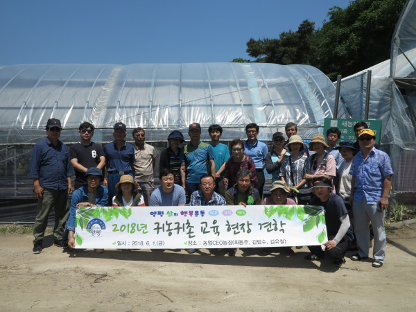 경기 양평군농업기술센터는 지난 1일 농업 현장에서 목소리를 듣는다는 취지로 귀농귀촌 교육생 25명과 함께 지역내 농업전문경영인으로 선발된 경기농업CEO의 농장을 방문했다. 사진은 농장 관계자와 교육생들이 기념촬영을 하는 모습. (사진제공=양평군청)