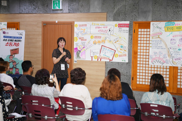 경기 오산시는 지난 5일 시청 물향기실에서 소통리더 양성과정에 참여한 수강생 및 주민자치·평생학습 관계자 등이 참석한 가운데 ‘2018년 소통리더 양성과정 성과공유회·수료식’을 개최했다. 사진은 성과공유회에서 한 참가자가 발표를 진행하고 있는 모습. (사진제공=오산시청)