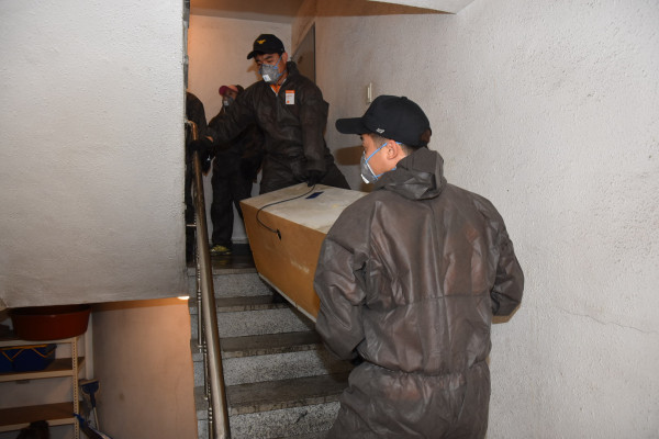 도봉소방서는 지난 5월31일 도봉구 방학동에 일어난 다세대주택 화재로 어려움을 겪고 있는 거주자 이씨를 돕기 위해 최근 화재 피해 복구 재활지원단을 운영했다. 이날 지원단에는 소방대원과 의용소방대원, 도봉구청 등 40여명이 참여했다. 사진은 참여자들이 짐을 옮기고 있는 모습. (사진제공=도봉소방서)