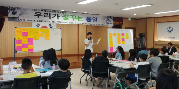 경기 김포교육지원청은 지난 8일 지역내 초·중·고 학생회장 및 부회장 230여명이 모인 가운데 ‘2018 상반기 학생자치회 대토론회’를 실시했다. 사진은 토론회에 참여한 학생이 발표를 하고 있는 모습. (사진제공=김포교육지원청)