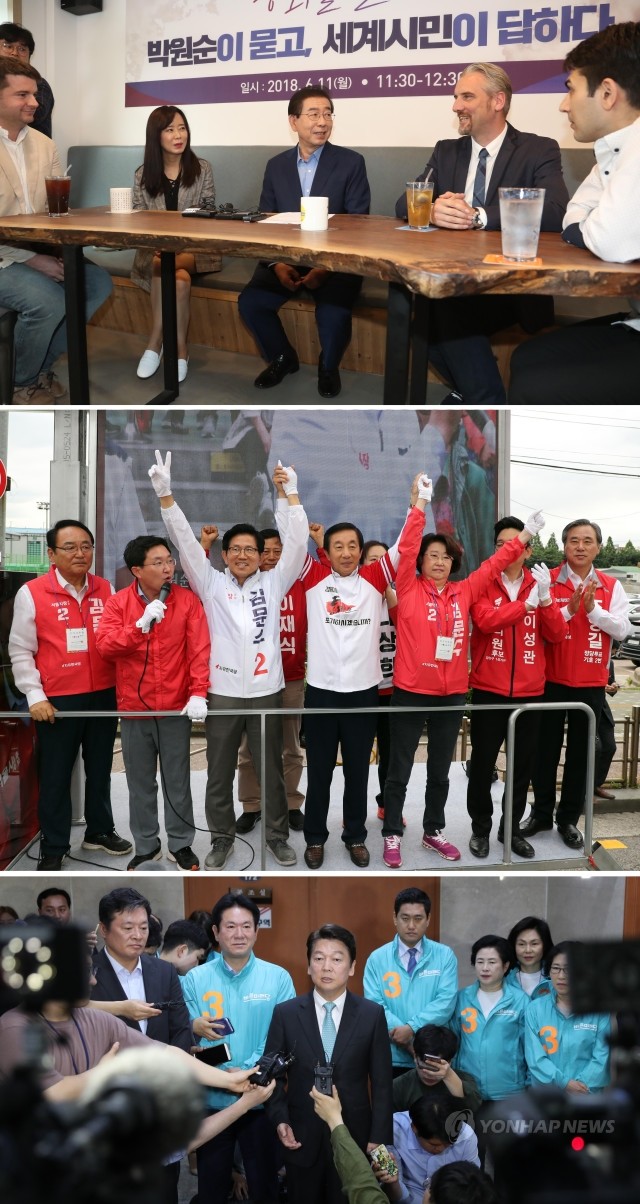 더불어민주당 박원순 서울시장 후보가 11일 오전 서울 마포구 평화다방에서 열린 '평화를 말하다, 박원순이 묻고 세계시민이 답하다' 행사에서 인사말을 하고 있다. (위부터) 자유한국당 김문수 서울시장 후보가 김성태 원내대표 등과 함께 11일 서울 목동 거리에서 거리유세를 벌이며 시민들에게 지지를 부탁하고 있다. 바른미래당 안철수 서울시장 후보가 11일 오전 국회 정론관에서 기자회견을 마치고 질문에 답하고 있다.