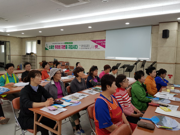 인천 옹진군자원봉사센터가 옹진군 자월면에서‘Green 스마일 대이작’프로그램을 진행한다. 사진은 지난 8일 ‘Green 스마일 대이작’프로그램에 참여자들이 교육을 듣고 있는 모습. (사진제공=옹진군청)