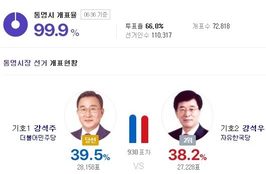 눈길을 끄는 것은 두 후보의 득표율과 차이. 14일 오전 6시 기준으로 강석주 통영시장 당선인은 39.5%, 강석우 후보는 38.2%를 기록했다. 표차이를 보면 930표다.