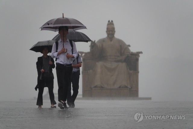 장맛비처럼 장대비가 내린 14일 이른 아침 서울 광화문 광장에서 시민들이 출근길을 재촉하고 있다.