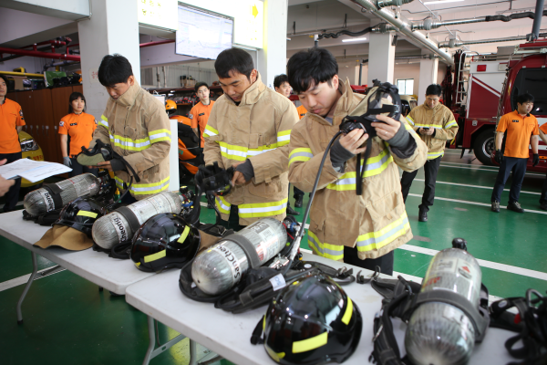 영등포소방서는 소방활동에 필요한 팀별 또는 개인별 전술 및 기술능력을 평가하기 위해 지난 12일 오전 차고에서 ‘2018년 상반기 소방전술훈련 평가’를 실시했다. 사진은 소방관들이 공기호흡기 장착 훈련을 하는 모습.(사진제공=영등포소방서)