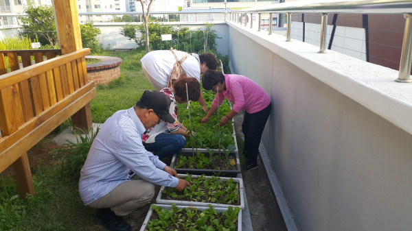 경기 안산시 초지동통장협의회는 14일 초지동행정복지센터 옥상텃밭에서 그동안 재배해온 쌈채소를 수확했다. 사진은 참여자들이 상추, 치커리, 당귀 등을 수확하고 있는 모습.(사진제공=안산시청)