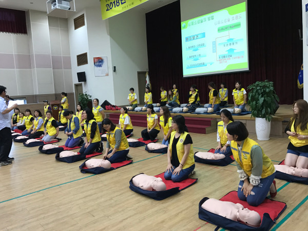 경기 김포경찰서는 14일 오전 10시 경찰서 대강당에서 어머니폴리스 연합단 및 회원 100여명이 참석한 가운데 응급처치 및 심폐소생술(CPR) 교육을 실시했다. 사진은 참여자들이 심폐소생술 실습을 하고 있는 모습.(사진제공=김포경찰서)