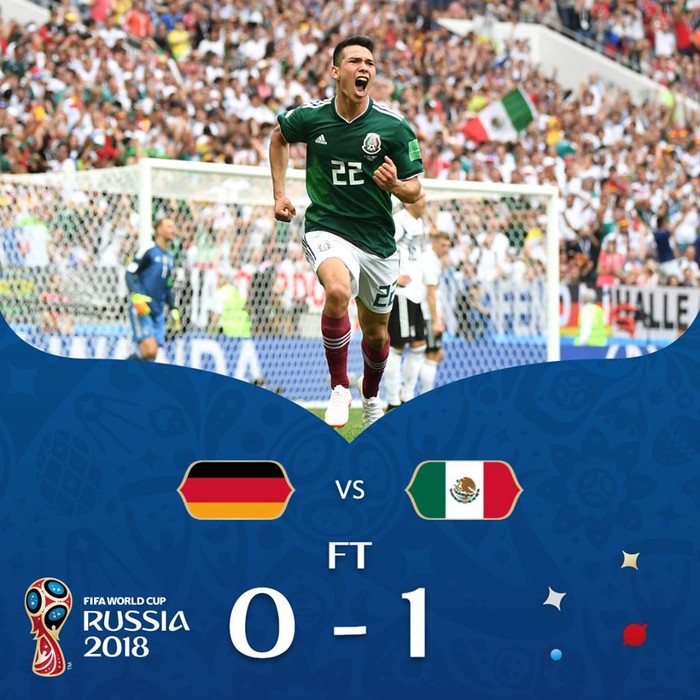 18일 자정(한국시간) 러시아 루즈니키 스타디움에서 열린 2018 러시아 월드컵 F조 독일과 멕시코의 경기에서 멕시코가 독일에 1대 0으로 승리했다. 이 경기는 이번 대회 최대의 이변이 됐다.
