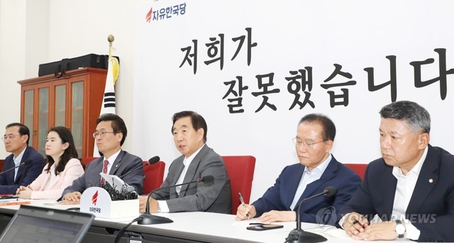 자유한국당 김성태 당대표 권한대행(가운데)이 18일 오전 국회에서 현안 관련 기자회견을 열고 발언하고 있다.