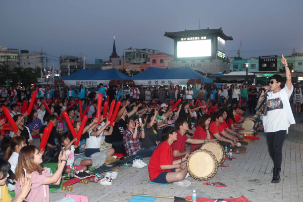 인천 동구는 18일 동인천역 북광장에서 대형 LED 전광판을 통해 ‘2018 FIFA 러시아 월드컵’ 대한민국과 스웨덴의 경기를 중계하고, 승리를 염원하는 거리응원을 진행했다. 사진은 거리응원 진행에 앞서 축하공연이 진행되고 있는 모습. (사진제공=인천 동구청)