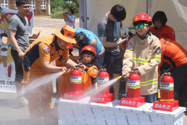 경기 안성소방서는 지난 16일 안성 팜랜드에서 진행된 ‘제3회 경기 웰빙 한우 고급육 평가대회 소비촉진 한마당 행사’와 연계해 소방안전 체험교실을 운영했다. 사진은 소방안전 체험교실에 참여한 어린이들이 소화기 활용 체험을 하는 모습. (사진제공=안성소방서)