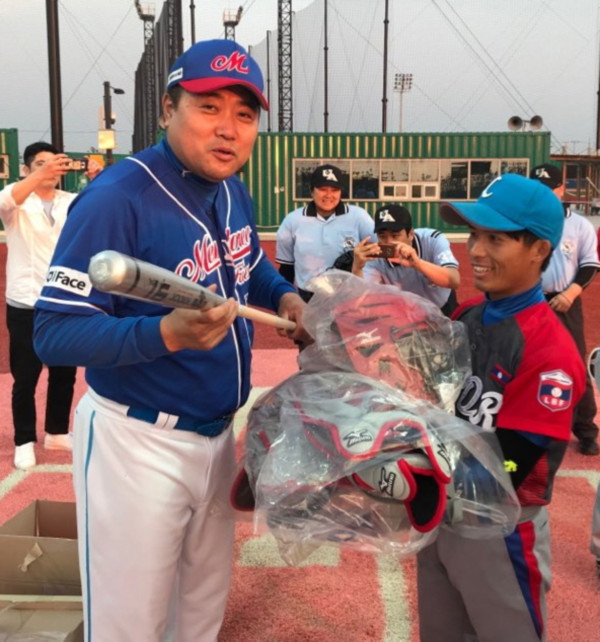 경기 화성시가 지난 18일 화성드림파크에서 화성시를 방문한 라오스 국가대표 야구팀과 친선경기를 진행했다. 사진은 친선경기에 참석한 양준혁 대한야구소프볼협회 이사가 라오스 국가대표 선수에게 선물을 전달하고 있는 모습. (사진제공=화성시청)