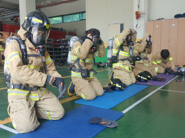 경기 이천소방서가 20~21일 양일간 현장활동 소방공무원 118명을 대상으로 ‘2018년 상반기 소방전술훈련평가’를 진행했다. 사진은 평가항목 중 공기호흡기 장착 평가에 참여한 소방공무원들의 모습. (사진제공=이천소방서)