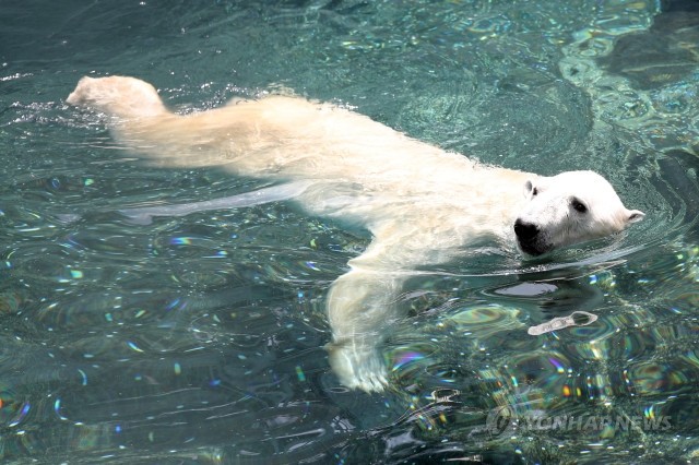 절기 상 하지인 21일 오전 경기 용인시 에버랜드 동물원에서 국내에 남아있는 유일한 북극곰인 통키(24살·수컷)가 수영장에 들어가 더위를 식히고 있다. 사람 나이로 70∼80세가 되는 통키는 오는 11월 영국 요크셔 야생공원으로 옮겨져 여생을 보낼 예정이다.