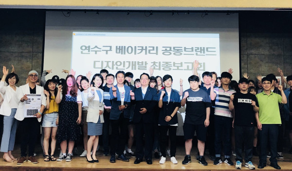 인천 연수구는 최근 구 베이커리 공동브랜드 디자인개발을 책임지고 있는 인천가톨릭대학교 조형예술대학에서 시각디자인학과 학생들의 디자인개발 최종보고회를 개최했다. 사진은 참여자들이 기념촬영을 하는 모습. (사진제공=연수구청)
