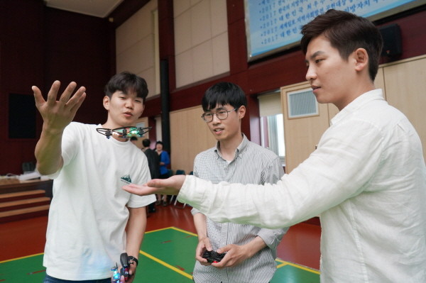 동대문구는 22일 오후, 구청 2층 다목적강당에서 ‘영상촬영 드론 전문가 양성과정’ 수강생들과 직원들이 참석한 가운데 ‘드론 조종 시연회’를 개최했다. 사진은 수강생들이 드론을 조종하고 있는 모습.(사진제공=동대문구청)