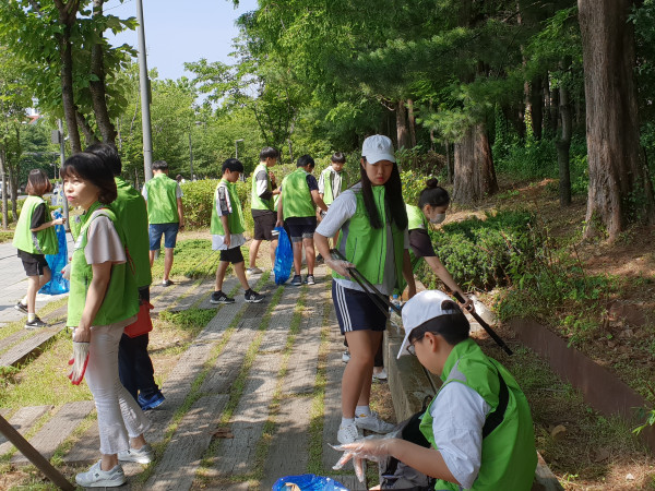최근 서울 노원구 공릉2동 주민센터는 경춘선 숲길공원에서 공릉2동 자원봉사캠프 주최로 지역내 중·고등학생 및 자원봉사자 등이 참석한 가운데 ‘청소년 환경정화활동’을 개최했다. 사진은 환경정화활동에 참여한 학생들이 쓰레기를 줍는 모습. (사진제공=노원구청)