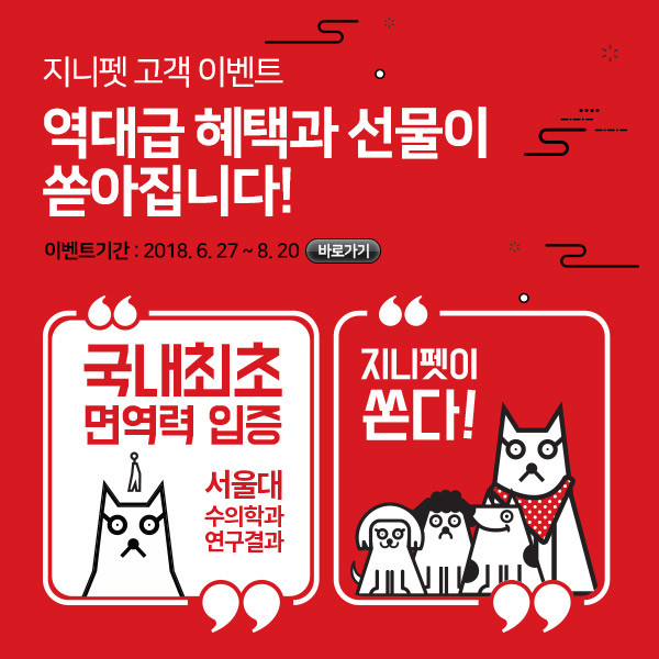 또한, 지니펫 홈페이지 회원 가입 시 ‘지니펫 면역키트’(지니펫 사료 50g*4개, 강아지 스카프)를 증정하며, 동시에 소매점에서는 사료 구매 시 200g을 추가 증정하고 스크래치 복권을 주는 이벤트를 진행할 예정이다.