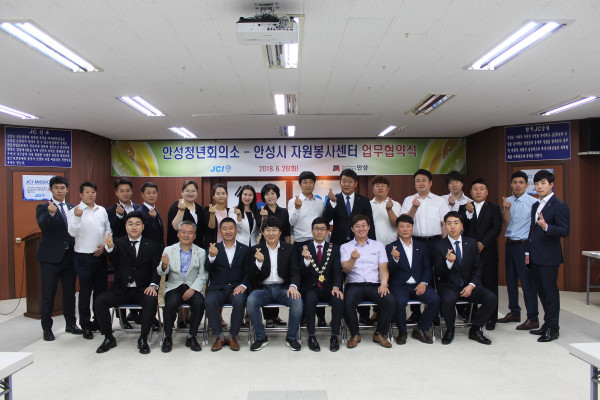 경기 안성시 청년회의소와 자원봉사센터는 자원봉사 가치 증진과 자원봉사 활성화를 위해 ‘자원봉사 활성화를 위한 업무협약(MOU)’을 체결했다. 사진은 양 기관 관계자들이 협약체결 후 기념촬영을 하는 모습. (사진제공=안성시청)