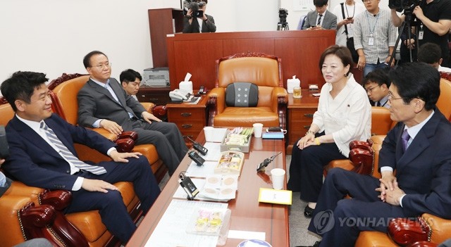 20대 국회 후반기 원구성 실무협상을 위한 4개 교섭단체 원내수석부대표 회동이 28일 오후 국회에서 열렸다. 바른미래당 유의동(왼쪽부터), 자유한국당 윤재옥, 더불어민주당 진선미, 평화와 정의의 의원 모임 윤소하 원내수석부대표가 이야기를 나누고 있다.