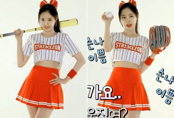 여기에 붉은 테니스 스커트에 야구 유니폼 상의를 매치한 손나은은 남성팬들의 심장에 결정타를 날렸다.
