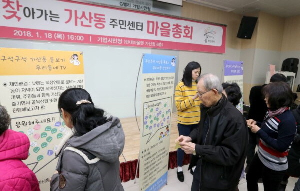 | ▲ 지난 1월 열린 '찾아가는 가산동 주민센터 마을총회'를 찾은 주민들이 각 의제에 대해 투표를 진행하고 있다. | ||