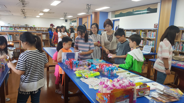 경기 김포시 하성초등학교는 최근 교내 도서관에서 학생들의 독서의식 고취와 독서습관 형성을 위해 진행한 '독서 포인트제'의 마무리로 '독서 달란트 시장'을 개최했다. 사진은 참여자들이 물건을 고르고 있는 모습. (사진제공=하성초등학교)