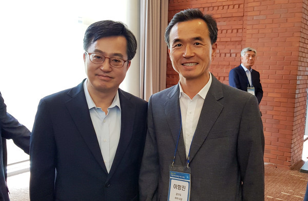 이항진 경기 여주시장은 최근 강원 평창군 알펜시아리조트에서 열린 ‘민선7기 지방자치단체장 비전포럼’에 참석해 김동연 경제부총리에게 중앙정부의 시 재정지원 확대를 요청했다. 사진은 김 부총리와 이 시장이 기념촬영을 하는 모습. (사진제공=여주시청)