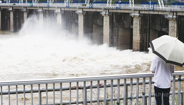 2일 오전 전날부터 내린 많은 비로 수문을 개방한 경기도 하남시 팔당댐에서 물이 쏟아지고 있다.