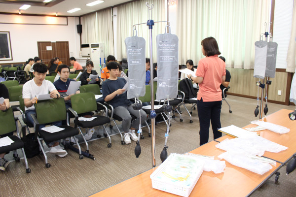 경기 이천소방서는 2일 소방서 대강당에서 패혈증 의심환자 소생률 향상을 위한 ‘2018년 패혈증 환자 살리기 교육’을 실시했다. 사진은 소방서 구급대원들이 분당서울대병원 응급의학과 의사에게 패혈증에 대한 이론 강의를 듣고 있는 모습. (사진제공=이천소방서)