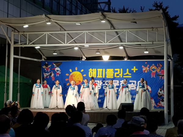 경기 남양주시 퇴계원면 주민자치위원회는 지난 6월29일 퇴계원역 광장 야외공연장에서 올해로 3회째를 맞이한 ‘2018년 해피플러스 광장문화공연’을 개최했다. 사진은 재능기부로 참여한 민요팀이 공연을 이어가는 모습. (사진제공=남양주시청)