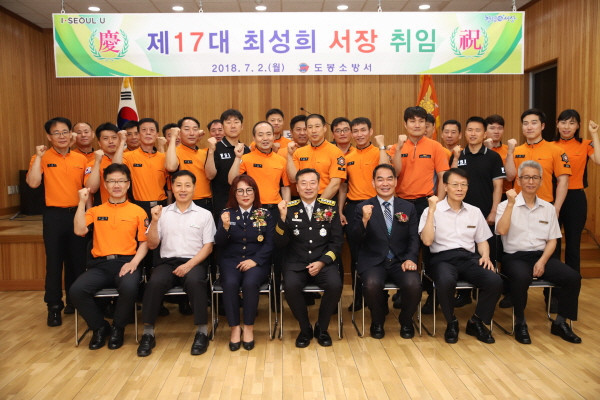 서울 도봉소방서는 2일 오전 5층 대강당에서 직원 및 의소대장단 80여명이 참석한 가운데 제17대 최성희 도봉소방서장의 취임식을 가졌다. 사진은 최 서장 및 관계자들이 기념촬영을 하는 모습. (사진제공=도봉소방서)