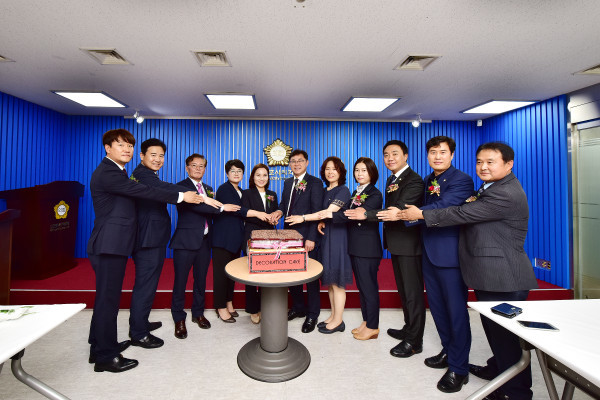 제7대 경기 김포시의회를 이끌어나갈 시의원들이 최근 의회청사에서 열린 개원식에서 참석, 한자리에 모여 케이크 커팅을 하며 기념촬영을 하고 있다. (사진제공=김포시의회)