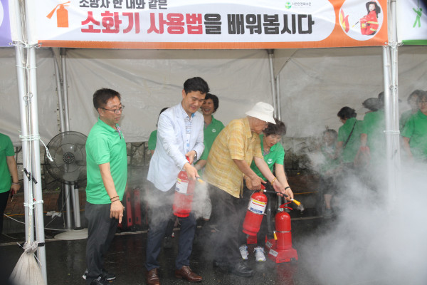 관악소방서는 3일 오후 봉천동 관악드림타운에서 서울소방재난본부가 주관하고 한국전기안전공사, 서울도시가스 등 유관기관이 참여한 ‘공동주택 안전의 날’ 행사를 진행했다. 사진은 행사에 참석한 서윤기 시의원 및 참여자들이 소화기 사용 실습을 하고 있는 모습. (사진제공=관악소방서)
