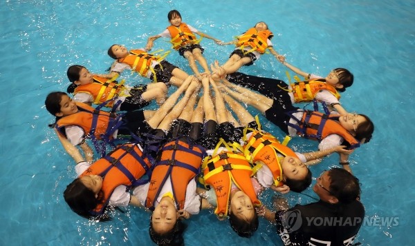 4일 부산 해운대구 벡스코에서 열린 제4회 대한민국 해양안전 엑스포'에서 학생들이 한국해양구조협회의 도움으로 생존 수영을 배우고 있다. 해양안전·사고예방 홍보전, 해양(조선)안전 기술 및 기자재 산업전, 국제 해양안전 콘퍼런스가 6일까지 열린다.