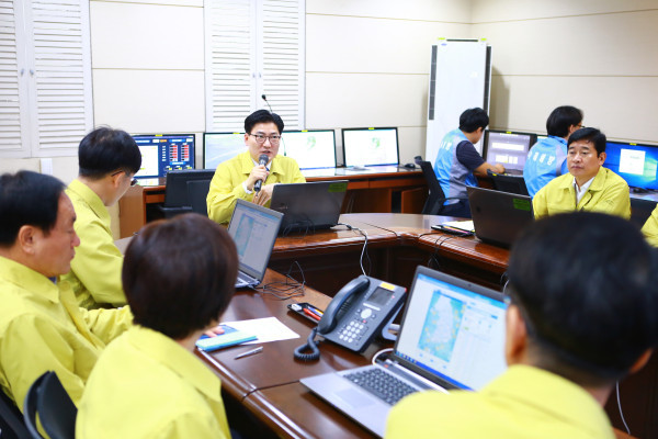 지난 2일 이정훈 서울 강동구청장이 강동구청 성안별관에 위치한 ‘재난안전대책본부’ 상황실에서 재난대책상황 회의를 개최하는 것으로 첫 업무를 시작했다. 사진은 이 구청장이 재난안전대책본부에서 회의를 진행하고 있는 모습. (사진제공=강동구청)