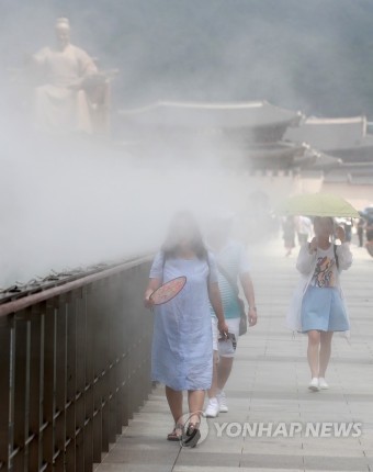 서울 낮기온이 30도를 웃돌며 더운 날씨를 보인 4일 서울 세종대로 광화문광장에 설치된 '쿨링 포그(Cooling Fog)' 주변으로 시민들이 부채와 양산을 들고 오가고 있다.