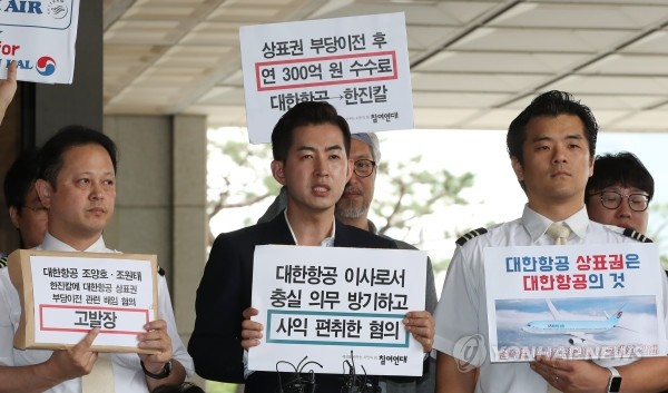 노조 등은 “2013년 회사분할 당시 상표권을 한진칼에 귀속시킨 뒤 대한항공이 매년 약 300억원의 상표권 사용료를 지급해왔다”며 “조양호 회장 등 총수 일가의 한진칼 지분이 28.95%에 달하는 상황에서 이들은 대한항공 대표이사로서의 충실 의무를 방기하고 사익을 편취했다”고 주장했다.