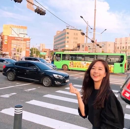 공개된 사진 속 오영주는 지나가는 버스를 배경으로 포즈를 취하고 있다. 버스에는 오영주가 모델로 활동 중인 제품의 광고가 붙어 있다.