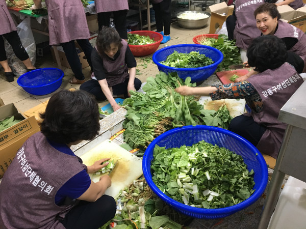 강동구는 최근 대한적십자회 강동급식소에서 강동구여성단체협의회와 함께 ‘사랑의 여름김치 나눔행사’를 개최했다. 이날 행사에 참여한 여성단체 회장들은 직접 열무김치를 담가 지역내 약 200여가구에 전달했다. 사진은 참여자들이 김치를 담그는 모습. (사진제공=강동구청)