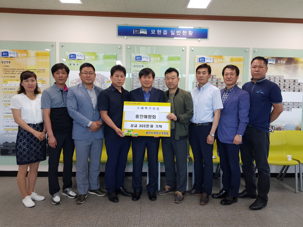 경기 용인지역 봉사단체인 용인애양회는 4일 집중호우로 침수피해를 입은 지역주민을 돕는 데 사용해 달라며 처인구 모현읍에 수해복구성금 300만원을 기탁했다. 사진은 기탁식에 참석한 관계자들이 기념촬영을 하는 모습. (사진제공=용인시청)